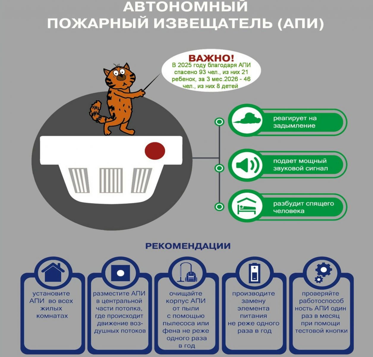 Автономный пожарный извещатель является одним из наиболее эффективных средств раннего обнаружения пожара. По имеющимся данным (случаи пожаров и загораний, информация о которых поступила в органы и подразделения по чрезвычайным ситуациям) только в прошлом году благодаря их срабатыванию спасено 93 человека, из них 21 ребенок (за 3 месяца 2026 года – 46 человек, из них 8 детей), а с начала их массового внедрения в 2002 году – более 2,8 тыс. человек.